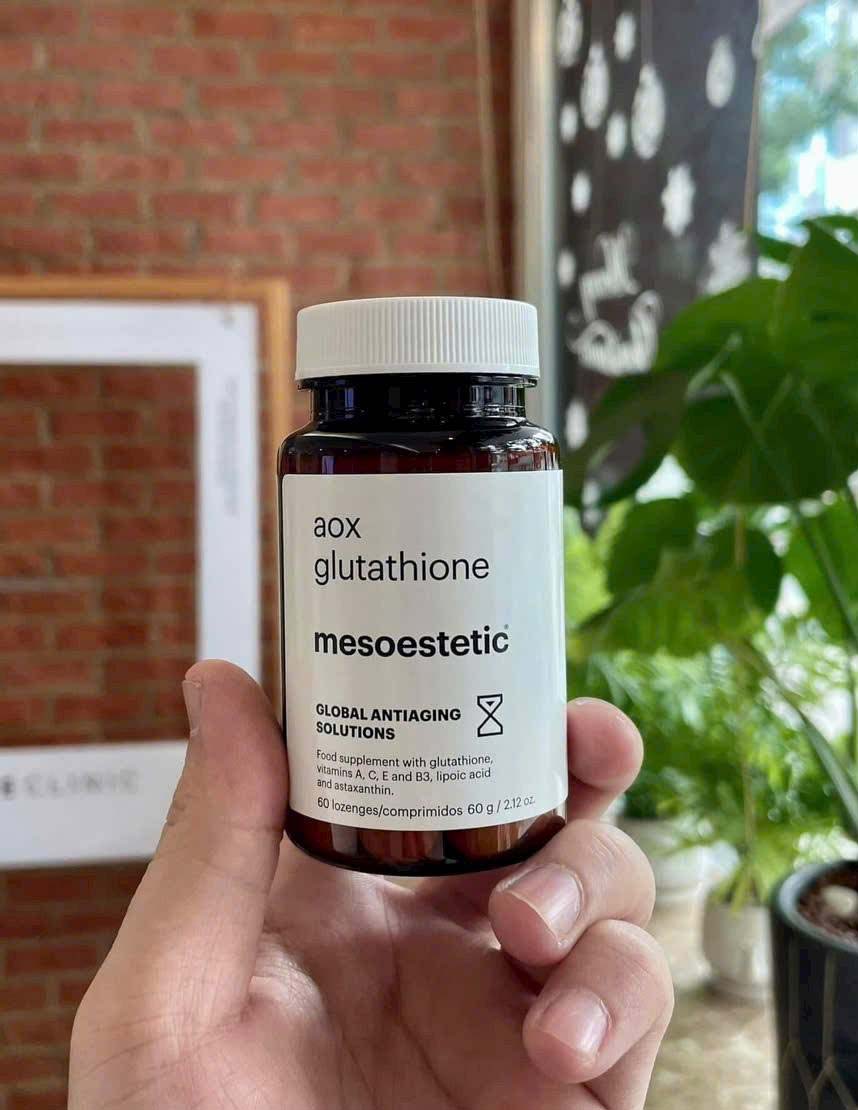 - Viên uống Mesoestetic kết hợp giữa Glutathione, Vitamin C và B3, hỗ trợ làm sáng da tự nhiên, cải thiện làn da xỉn màu do nắng, stress hoặc thiếu ngủ.