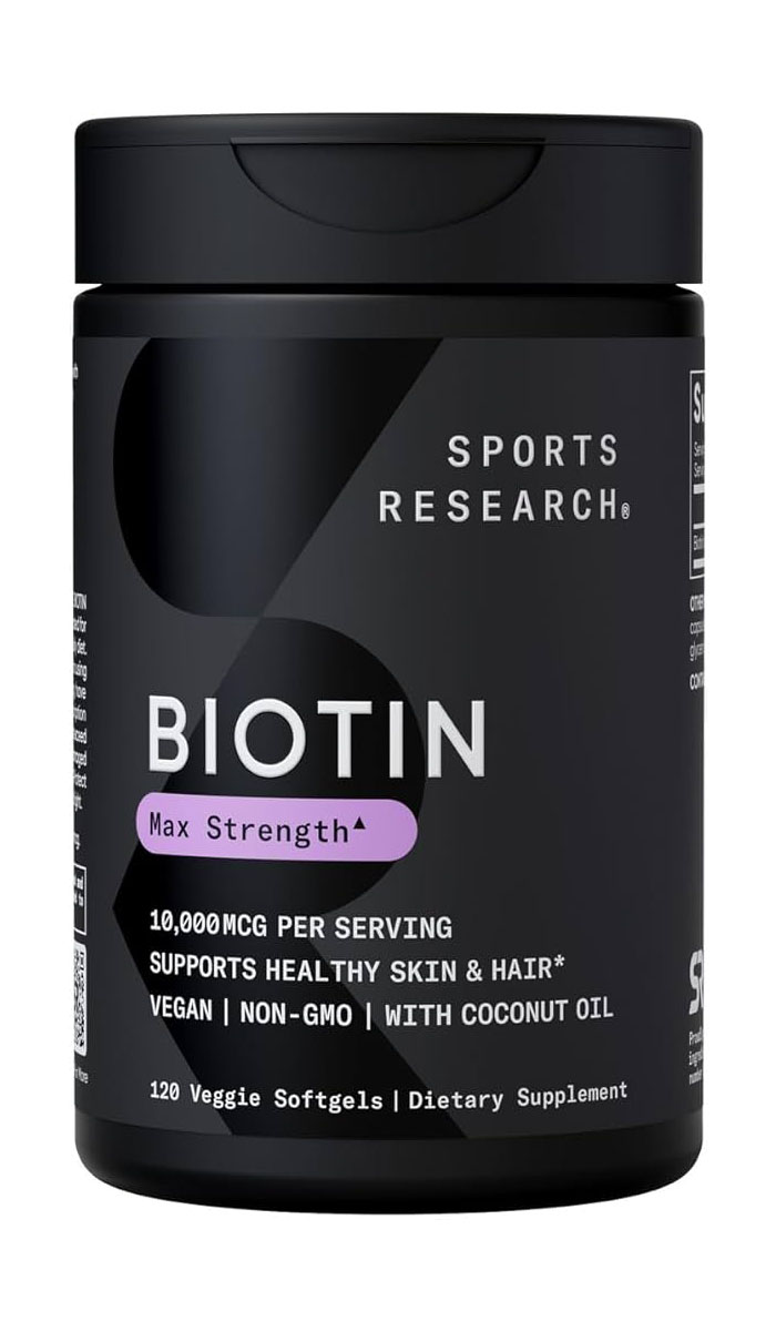 Biotin Max Strength Sports Research chứa hàm lượng biotin cao kết hợp cùng dầu dừa nguyên chất hữu cơ giúp cơ thể hấp thu tốt, giảm rụng tóc, nuôi dưỡng da đầu khỏe và kích thích tóc mọc dày, chắc khỏe