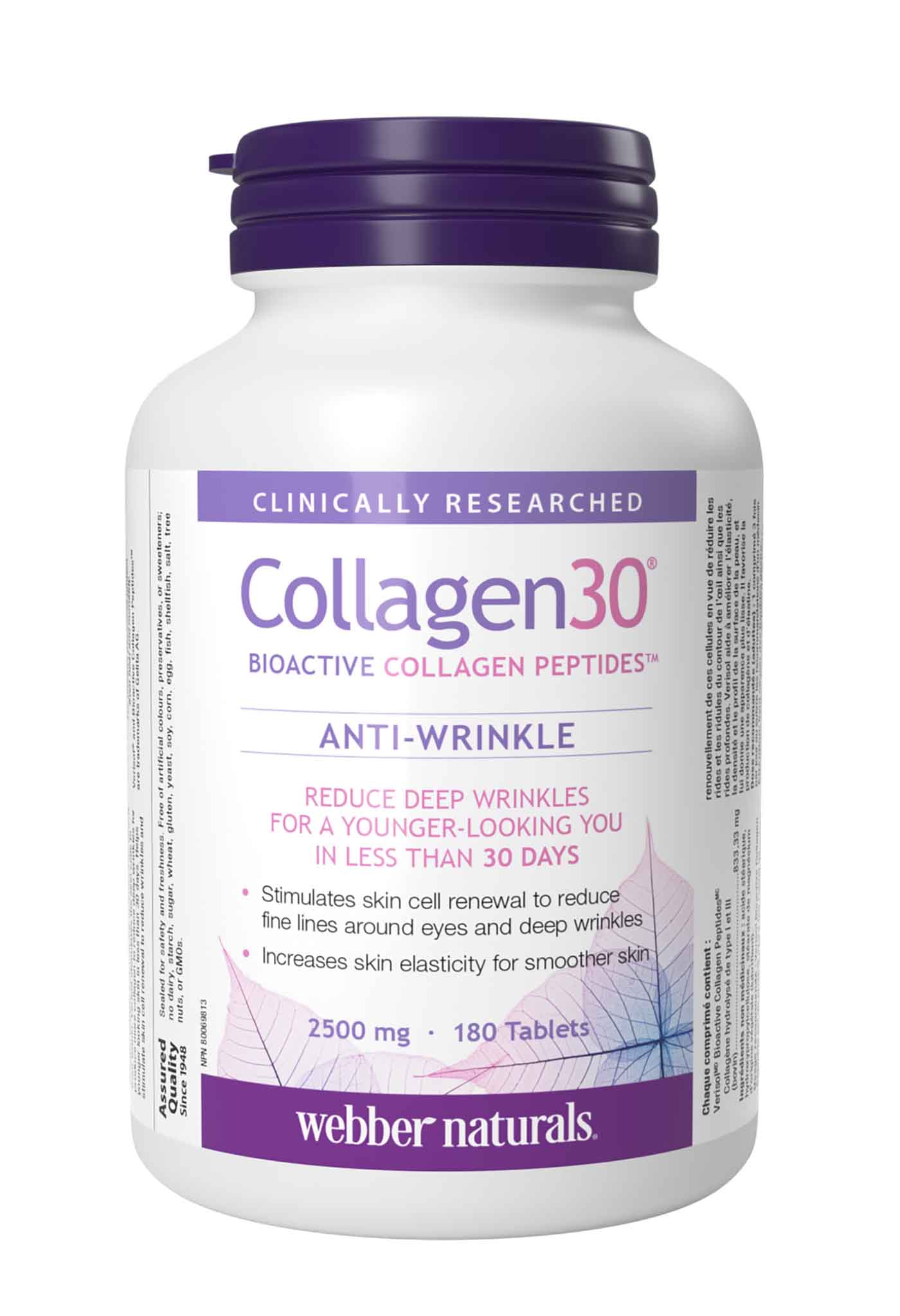 Collagen30 Webber Naturals cung cấp 2500mg collagen peptide hoạt tính, hỗ trợ kích thích tái tạo tế bào da, làm mờ vết nhăn quanh mắt và nếp gấp sâu, đồng thời nuôi dưỡng làn da căng mịn, săn chắc và trẻ trung hơn.
