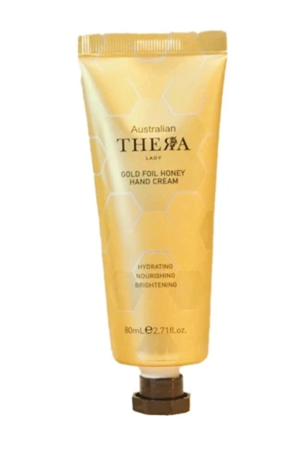 Kem dưỡng da tay Thera Gold Foil Honey Hand Cream công thức giàu dưỡng chất từ mật ong tự nhiên, bơ hạt mỡ, vàng lá cùng các hoạt chất dưỡng ẩm, giúp phục hồi da tay khô ráp, nuôi dưỡng làn da mềm mại, sáng mịn và bảo vệ da tay trước các tác nhân gây hại từ môi trường.