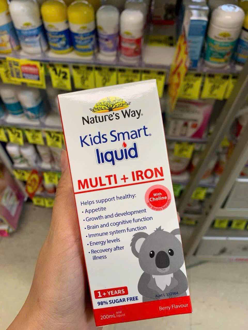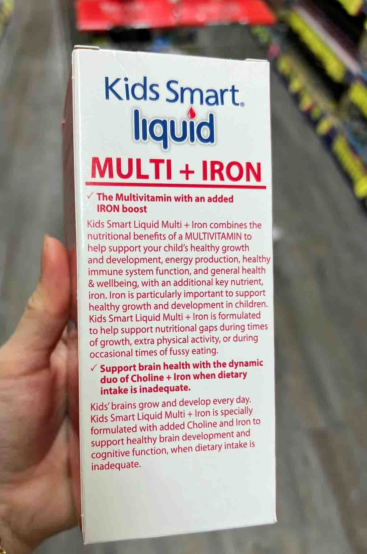 Kids Smart Liquid Multi Iron bổ sung sắt và vitamin thiết yếu dành cho trẻ từ 1 tuổi trở lên, công thức chứa sắt, choline và 12 loại vitamin – khoáng chất, hỗ trợ tăng đề kháng, đặc biệt phù hợp với trẻ biếng ăn, kén ăn hoặc có dấu hiệu thiếu vi chất. Với hương vị berry tự nhiên, ngọt dịu, dễ uống