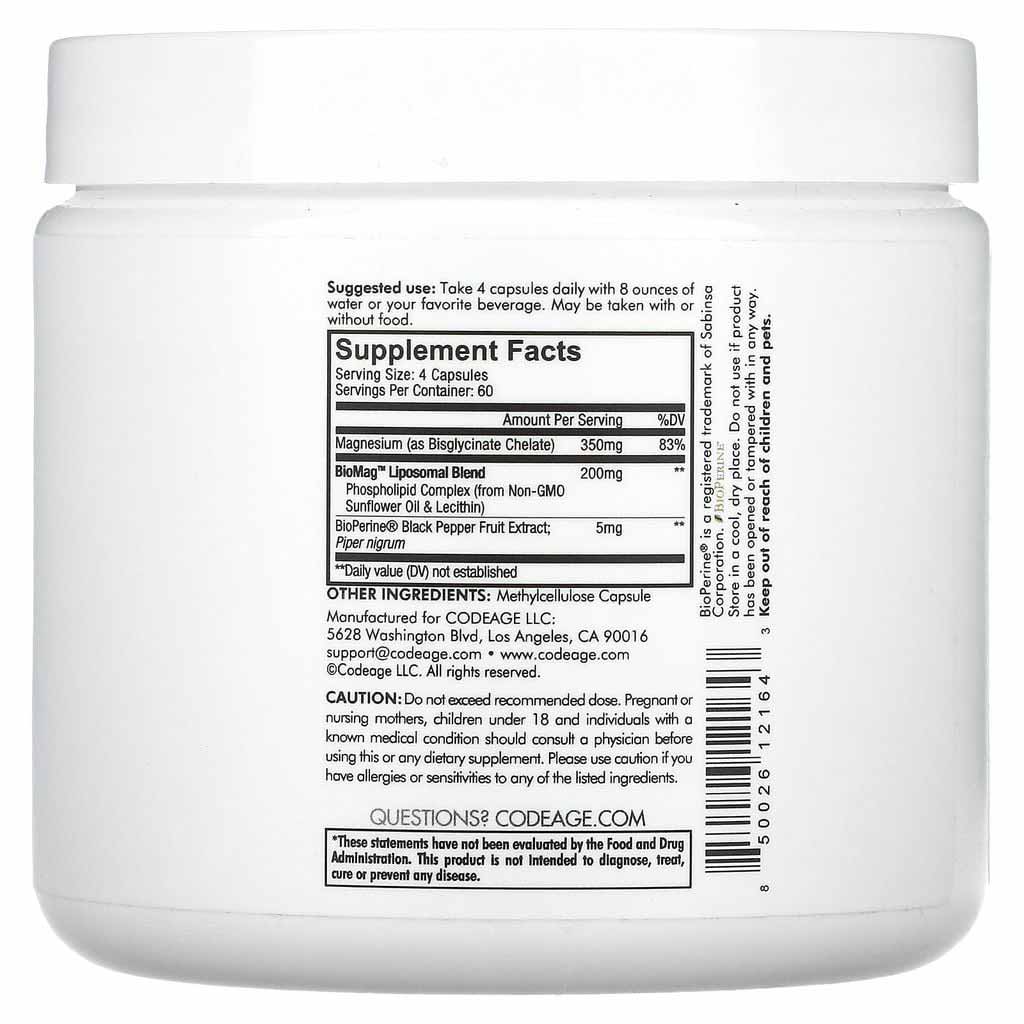 - Codeage Liposomal Magnesium Glycinate ứng dụng công nghệ Liposomal – phương pháp bao bọc hoạt chất trong các túi liposome có cấu trúc 2 lớp lipid tương tự màng tế bào tự nhiên.