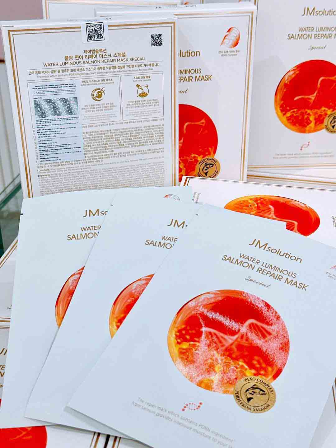- Mặt nạ JMsolution Water Luminous Salmon Repair Mask có essence dạng kem đặc giàu dưỡng chất, nhưng khi thoa lên da lại thấm khá nhanh, không gây nặng mặt hay bết dính khó chịu.