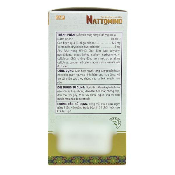 Nattomind công thức kết hợp tinh hoa Đông – Tây, nổi bật thành phần Nattokinase nổi tiếng tại Nhật Bản giúp tiêu fibrin, hỗ trợ tan cục máu đông và cao bạch quả và vitamin B6, hỗ trợ tăng tuần hoàn máu não, cải thiện trí nhớ và giảm triệu chứng thiếu máu não.
