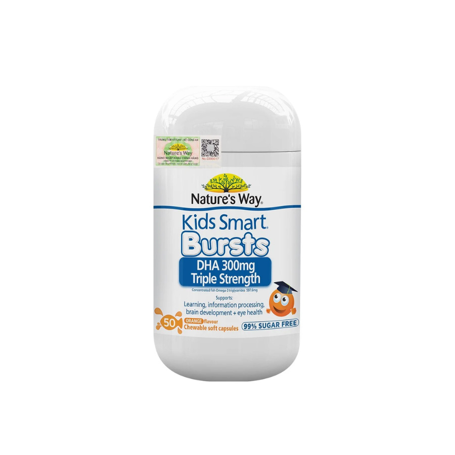 Nature’s Way Bursts DHA 300mg Triple Strength với hàm lượng DHA 300mg Triple Strength, viên nang mềm vị cam thơm ngon, hỗ trợ tốt cho não bộ, khả năng ghi nhớ, tập trung và đôi mắt sáng khỏe của bé trong giai đoạn tăng trưởng quan trọng.