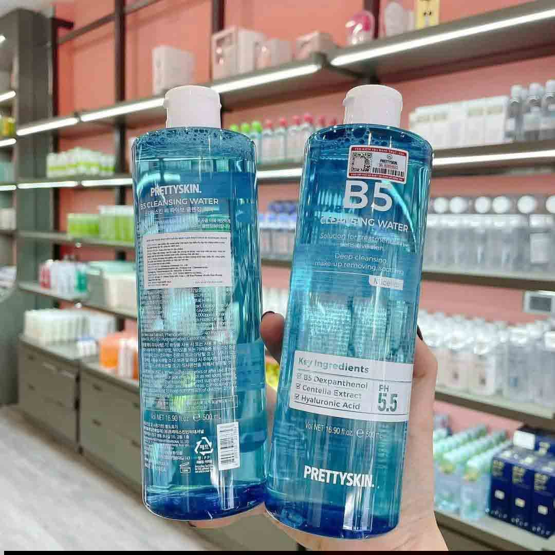 Nước tẩy trang B5 Prettyskin ứng dụng công nghệ Micellar hiện đại, giúp loại bỏ lớp trang điểm, bụi bẩn và dầu thừa một cách nhẹ nhàng, nổi bật với Panthenol, rau má và Hyaluronic Acid, không chỉ làm sạch mà còn hỗ trợ phục hồi, cấp ẩm và làm dịu da, đặc biệt phù hợp với làn da nhạy cảm hoặc da đang treatment.