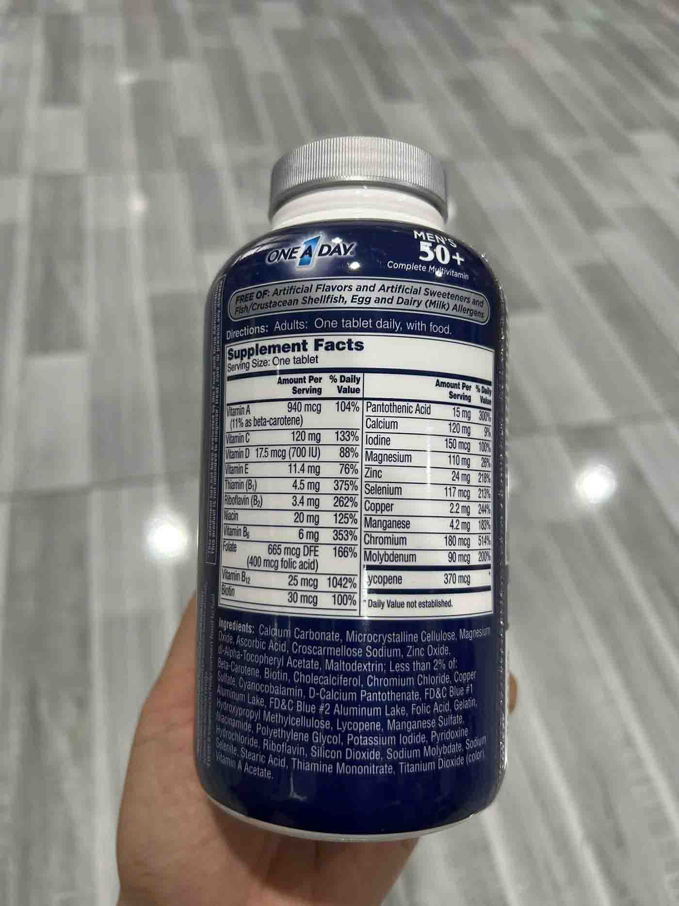 Viên uống One A Day Men’s 50+ được bào chế với đa dạng các loại vitamin như canxi, kẽm, Axit Folic, Lycopene, vitamin D,… thích hợp với nam giới từ 50 tuổi trở lên, hỗ trợ ổn định huyết áp, củng cố hệ miễn dịch, sinh lý, cải thiện sức khỏe tổng thể