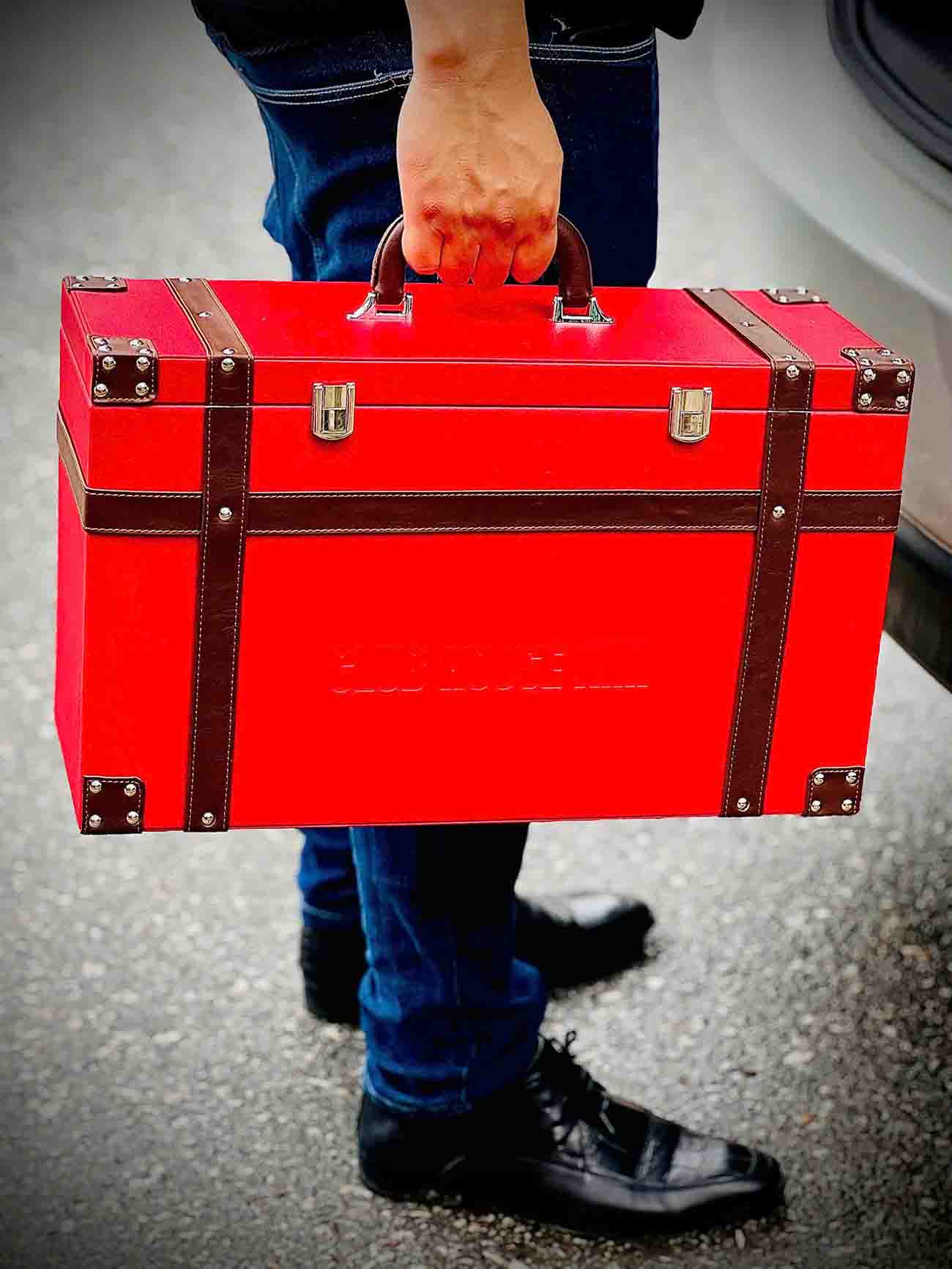 - Hộp quà màu đỏ sang trọng được thiết kế theo phong cách vali cao cấp, viền da nâu tinh tế, có khóa kim loại chắc chắn – thích hợp làm quà biếu tặng cao cấp.
