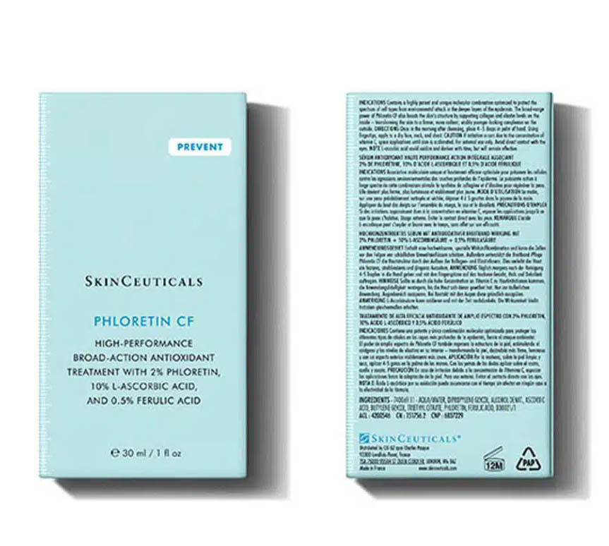 - Skinceutical CF kết hợp của vitamin C tinh khiết cùng Phloretin, giúp làm mờ các đốm sắc tố, làn da trở nên sáng hơn, đều màu hơn và rạng rỡ tự nhiên.