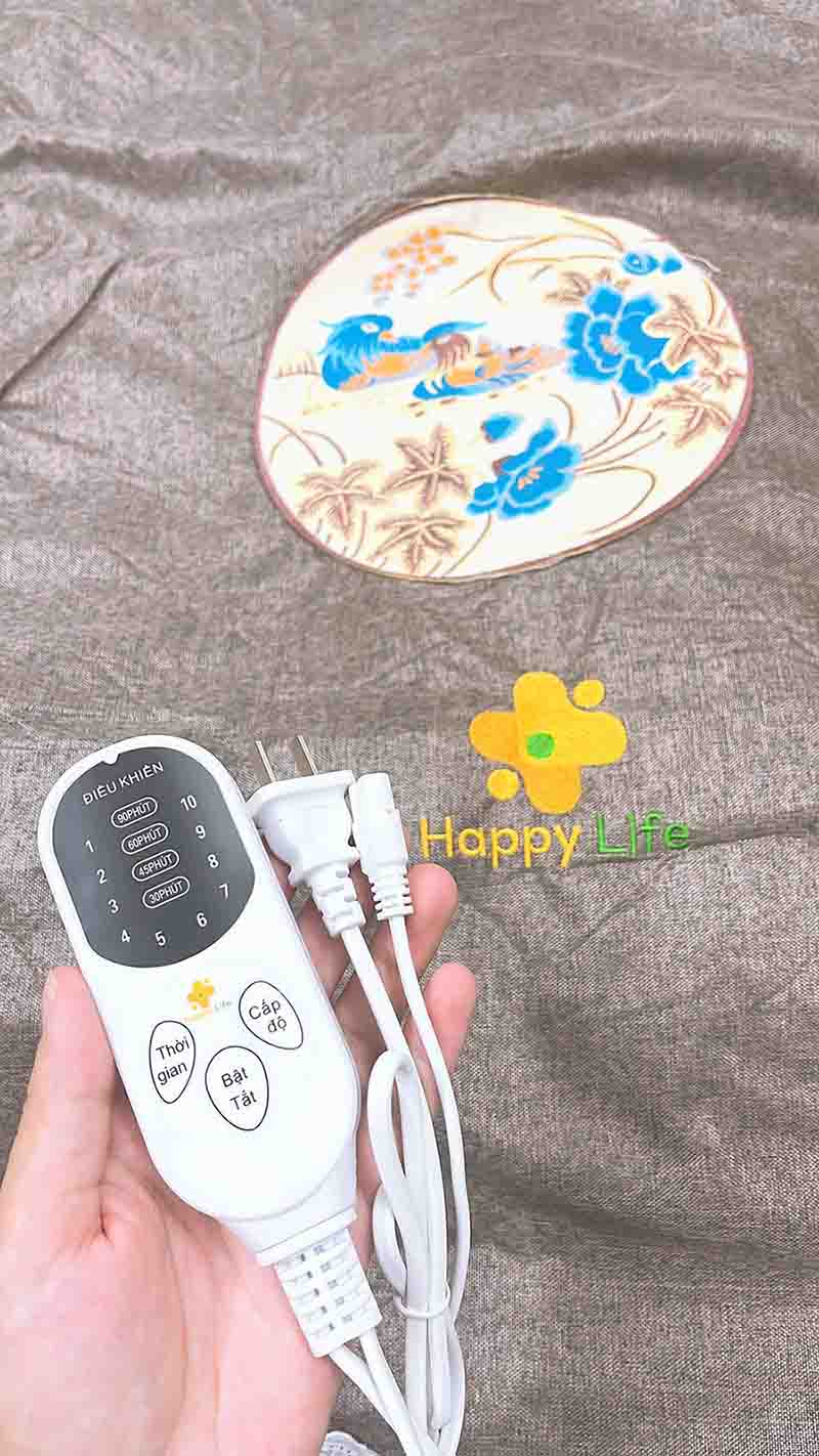 Thảm ngải cứu Happy Life được thiết kế hiện đại với lõi ngải cứu nguyên chất, thêu họa tiết tinh xảo, tích hợp điều khiển thông minh với 9 mức nhiệt + 4 chế độ hẹn giờ, mang đến trải nghiệm thư giãn, dễ chịu và hỗ trợ chăm sóc sức khỏe