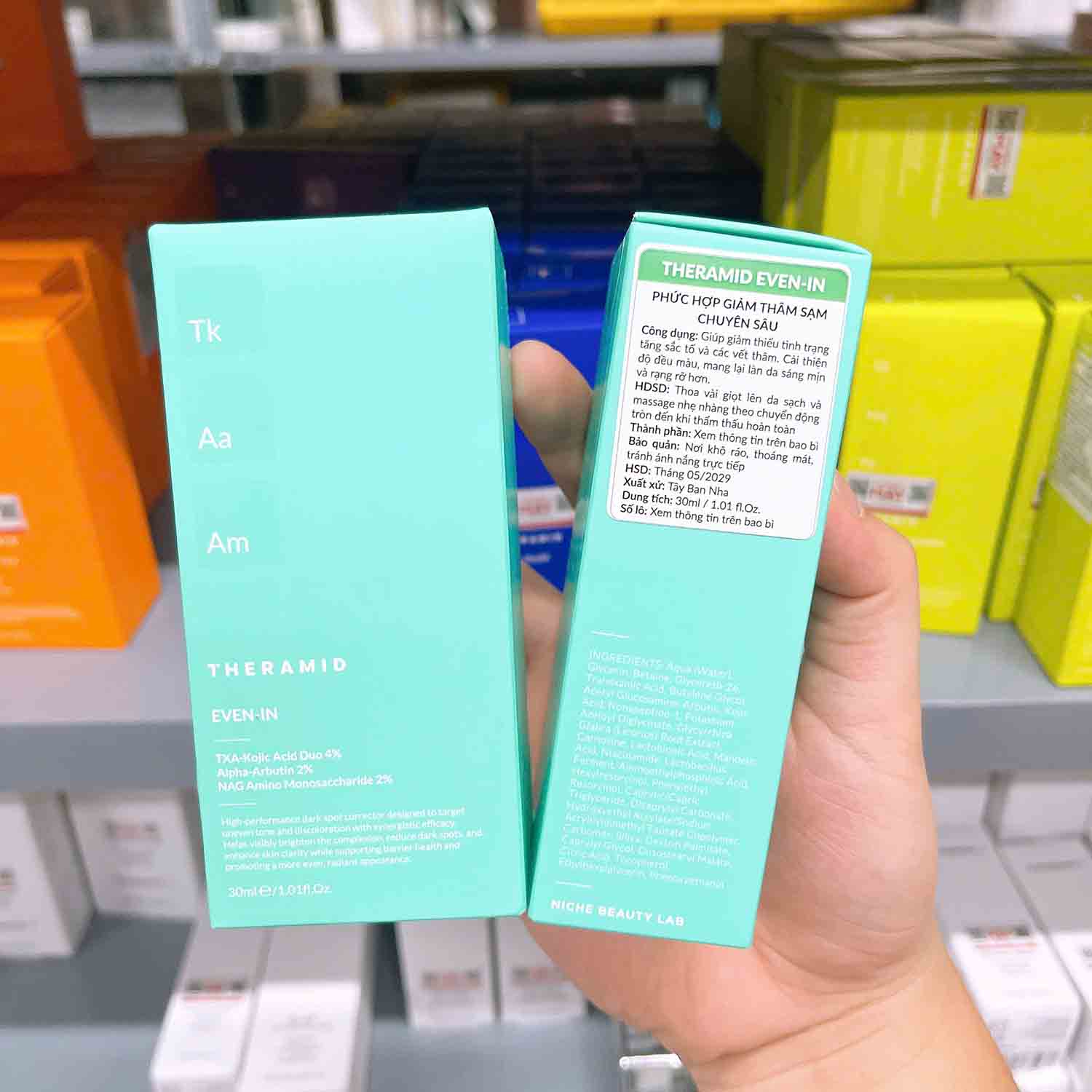 Theramid Even In Serum kết hợp giữa Tranexamic – Kojic Acid Duo 4%, Alpha Arbutin 2% và NAG Amino Monosaccharide 2%, giúp giảm sắc tố, làm sáng da, phục hồi hàng rào bảo vệ da, giảm thô ráp và tăng độ đàn hồi