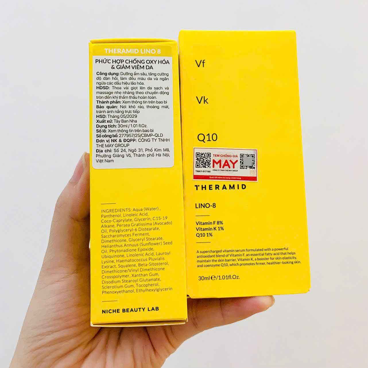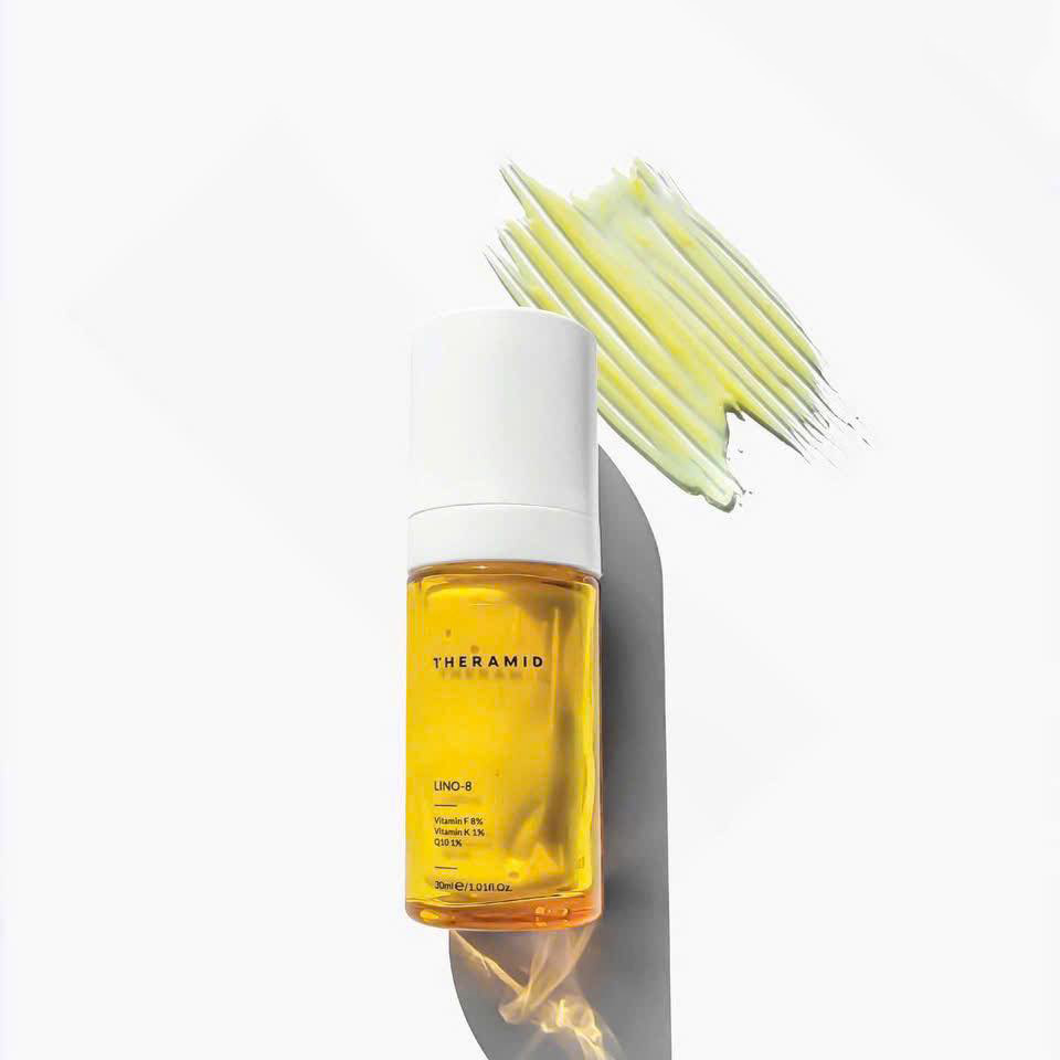 Theramid Lino 8 với 8% Vitamin F, 1% Vitamin K, Q10 1% không chỉ phục hồi hàng rào bảo vệ, chống oxy hóa mà còn cải thiện độ đàn hồi, giảm thâm, mờ nếp nhăn và tăng sáng