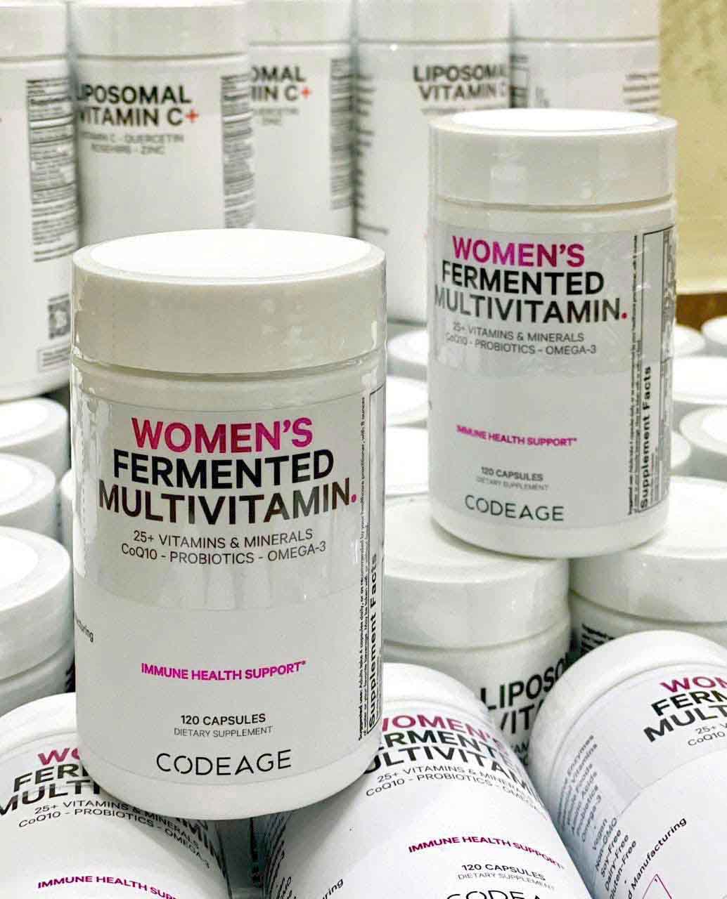 Women’s Fermented Multivitamin Codeage với công thức lên men tiên tiến kết hợp 25+ vitamin, khoáng chất, CoQ10, Probiotics và Omega-3, hỗ trợ miễn dịch, tăng năng lượng, cải thiện sức khỏe tim mạch và chăm sóc sắc đẹp từ bên trong.